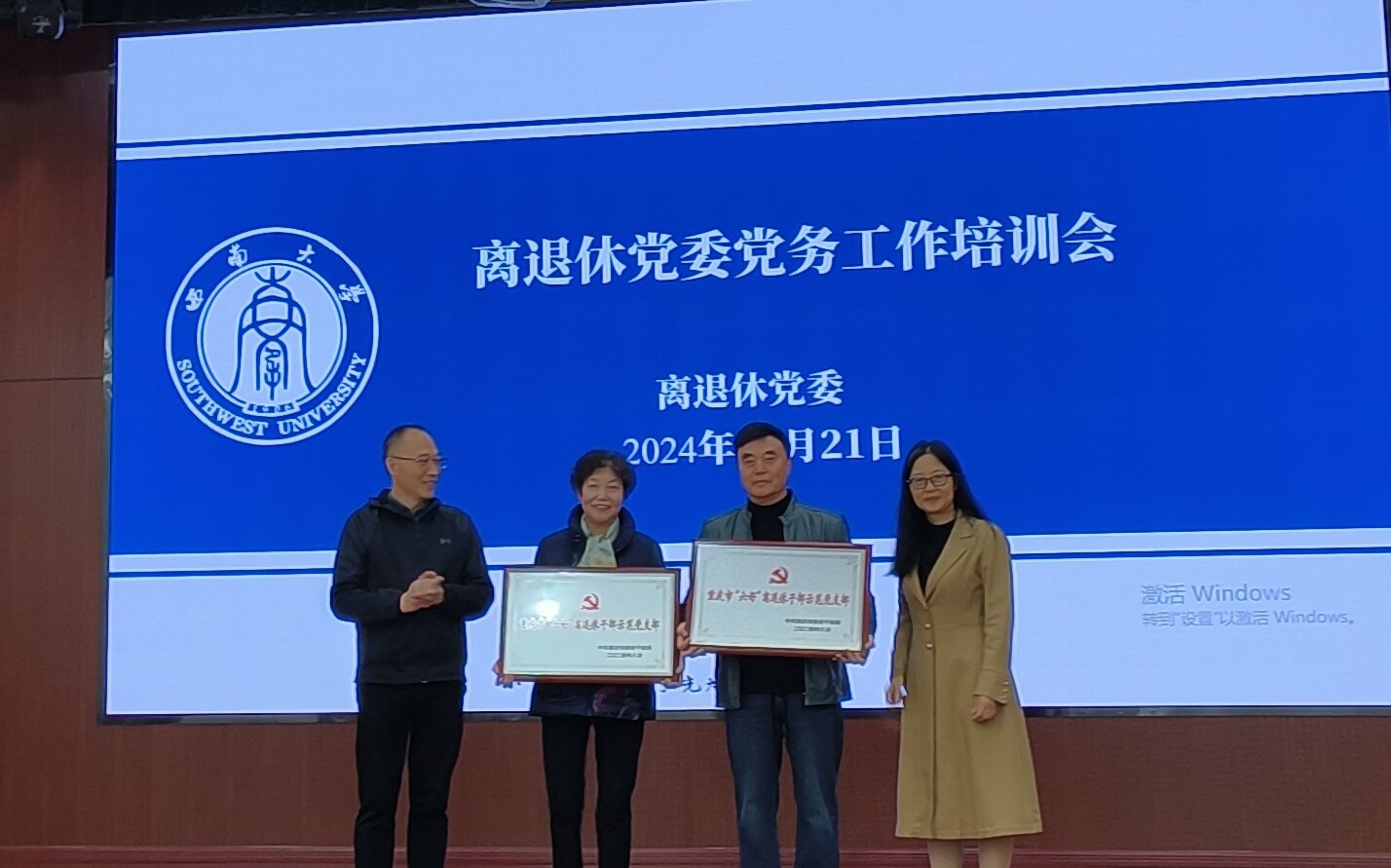 会上,还对荣获首批重庆市“六好”离退休干部示范党支部的退休第二党支部、第十七党支部进行了表彰。离退休工作处处长鲁森宣读了《中共重庆市委老干部局关于命名首批重庆市“六好”离退休干部示范党支部的通报》,李红、鲁森为两个支部授牌,退休第二党支部书记杨尚秋、第十七党支部书记唐庆学分享了支部建设经验。
