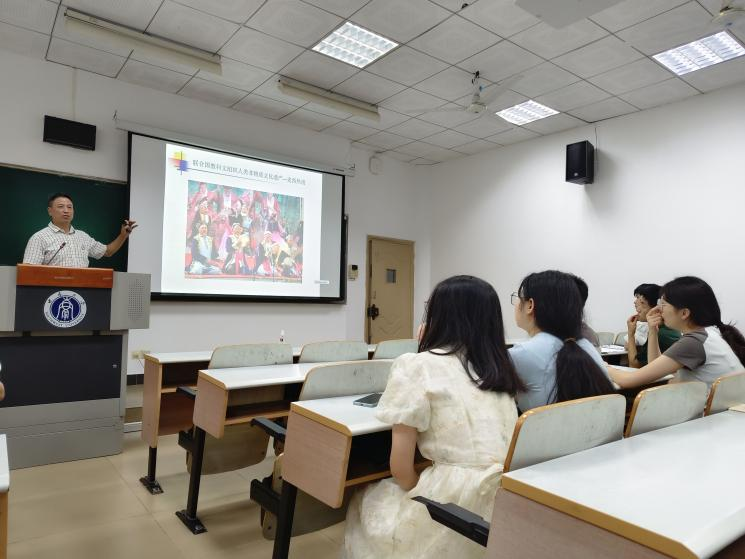 周大明教授以深厚的学术底蕴引领青年学子深入探索中华非物质文化遗产的博大精深,从新疆的麦西热甫到蒙古族的呼麦,从侗族的大歌到藏族的唐卡,从国粹京剧到地方戏曲越剧、黄梅戏,再到民间技艺抖空竹,全面而细致地阐释了这些非物质文化遗产项目的历史渊源、艺术特色与当代价值,激发青年学子对传统文化的热爱与传承使命感。