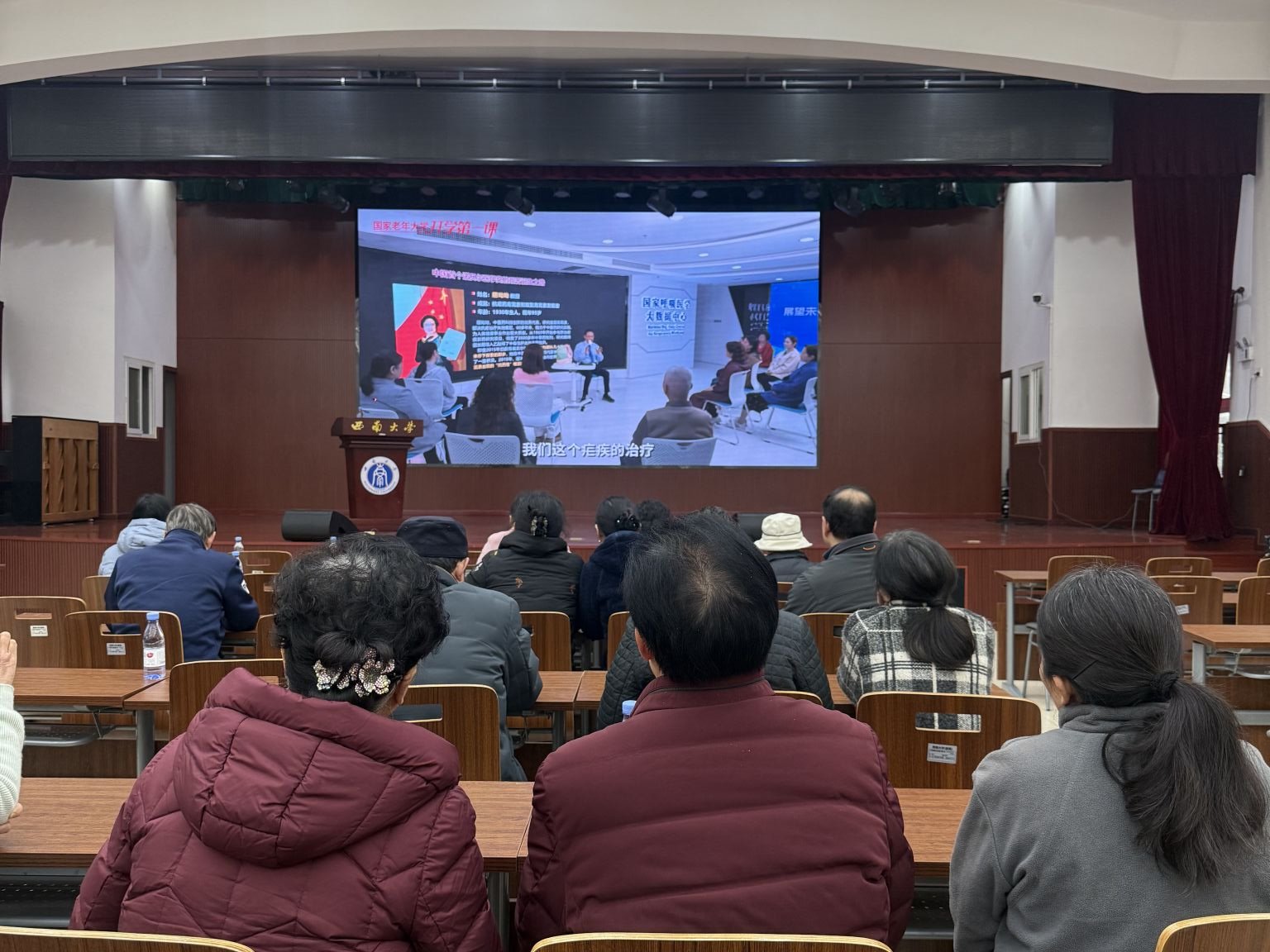 2025年3月31日,西南大学老年大学积极响应国家老年大学号召,组织全体学员及学校离退休教职工通过集中观看和居家学习相结合的方式,共同收看了由钟南山院士主讲的以《展望未来—健康就在您手中!》为题的国家老年大学开学第一课。此次活动通过周密部署、多措并举,实现了老同志群体学习参与全覆盖,引发热烈反响。