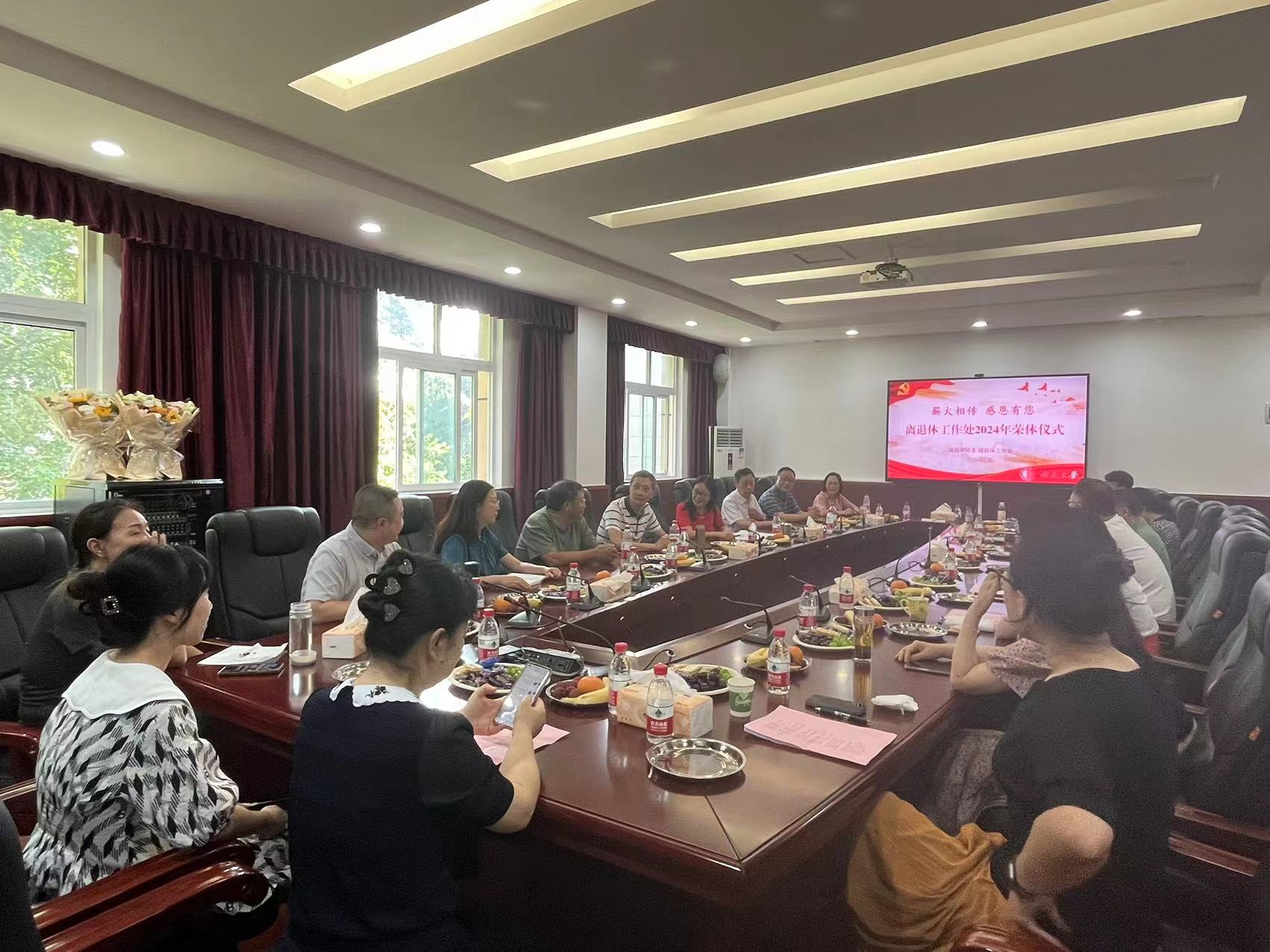 相关科室代表为两位老领导献上鲜花,全体科长集体朗诵诗歌《莫道桑榆晚,为霞尚满天》,以此表达对老领导们辛勤付出的赞美和对他们未来生活的美好祝愿。