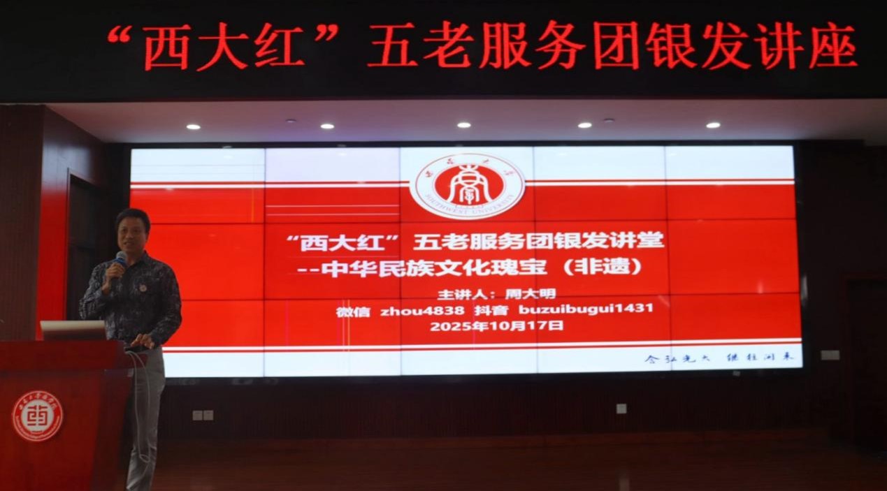 为拓宽学生学术视野,激发多学科探索兴趣,助力其综合素质全面提升,10月17日,PA视讯副秘书长、“西大红”五老服务团引航服务部部长周大明以“中华民族文化瑰宝”为主题,为药学院学生深度解读中外优秀传统文化及非遗魅力。