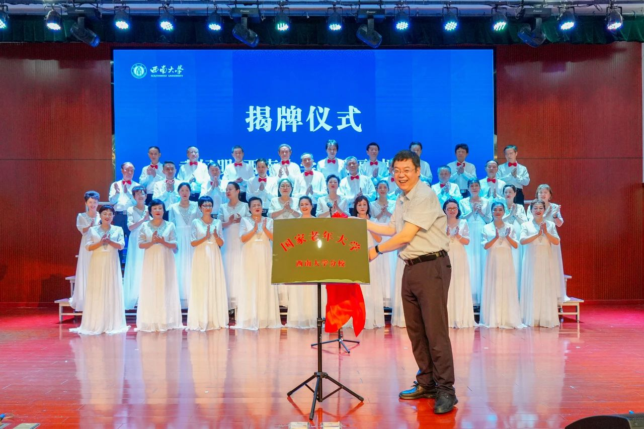 活动现场,武好明为“国家老年大学西南大学分校”揭牌,标志着我校老年大学教育事业迈上新台阶。武好明在讲话中强调,我校老年大学自2008年创办以来,始终秉持“陶冶情操、增长知识、促进健康、服务社会”的宗旨,累计培养学员15000余人次。2024年12月,学校老年大学成功获批国家老年大学分校,这既是对我校老年教育事业的肯定,也为未来发展注入了强劲动力。未来,学校将以第四次党代会精神为指引,继续扩大优质教育资源供给,探索老年教育创新路径,打造“安心、舒心、暖心、贴心”的学习乐园,为国家构建全民终身学习体系贡献西大智慧。