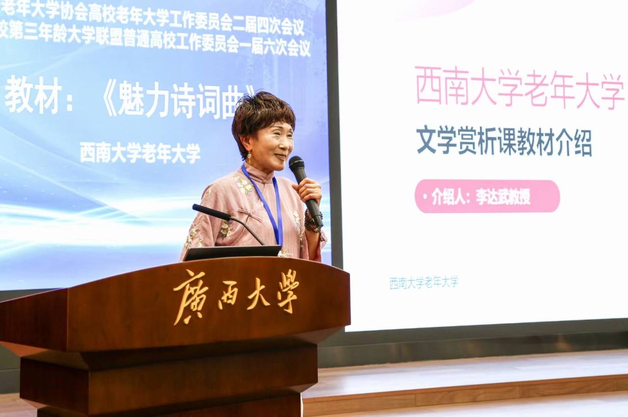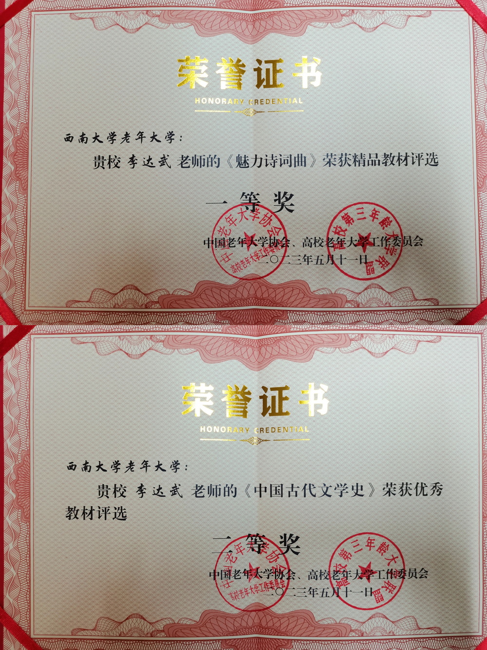 大会对各单位选送的精品教材进行了评选,经参赛单位汇报展示和专家评审,我校李达武老师编写的《魅力诗词曲》教材凭借其专业性、趣味性以及符合老年人学习需求的特点,得到了与会评审专家的一致好评,荣获精品教材一等奖;同时,李达武老师的《中国古代文学史》荣获优秀教材二等奖。